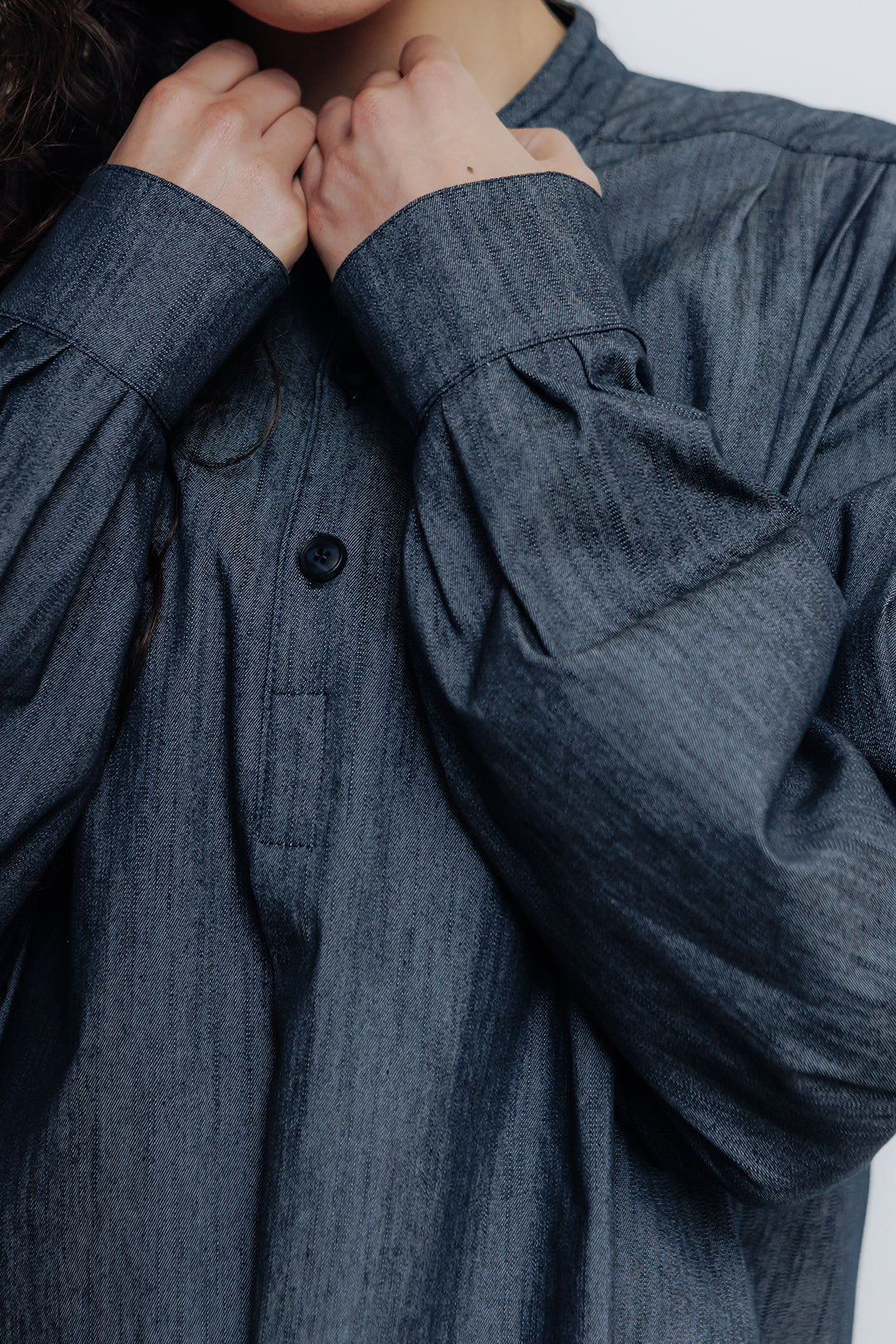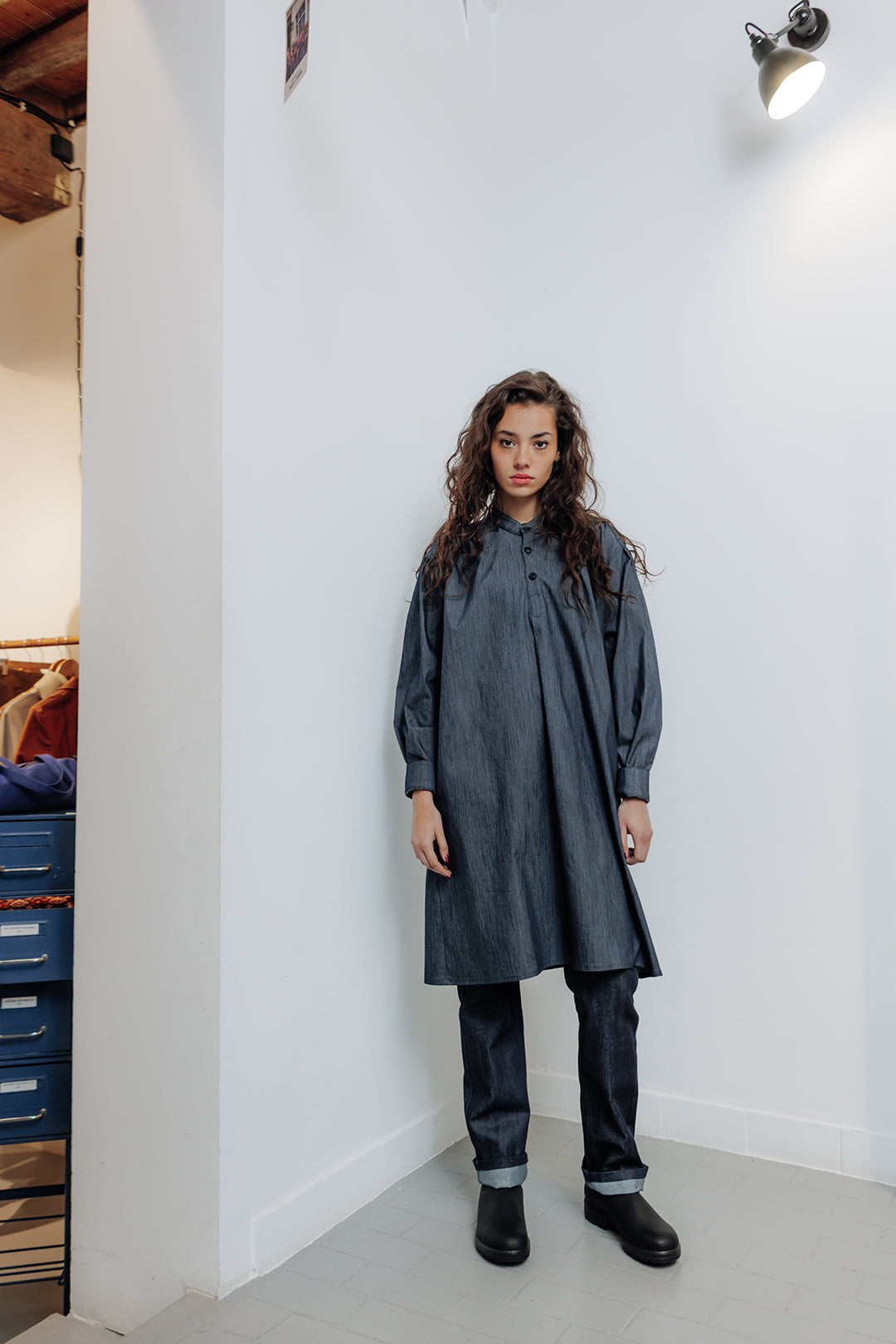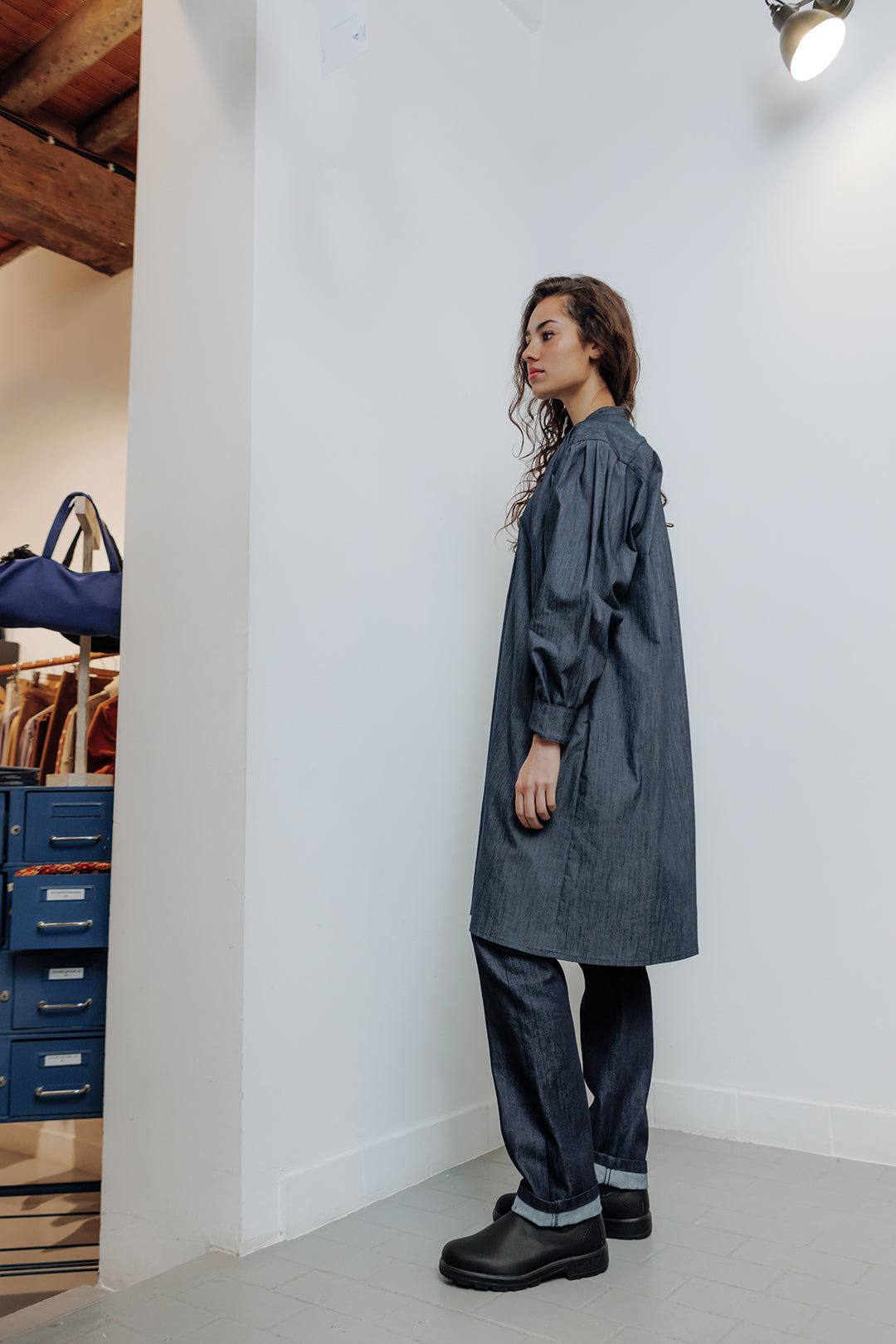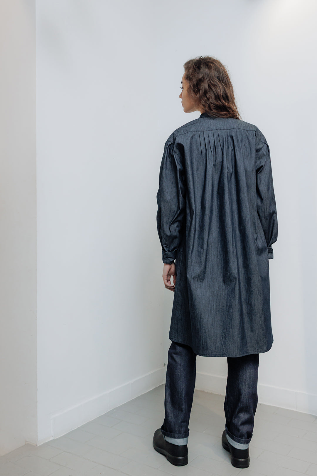 cette blouse de sculpteur réinterprétée comme une robe accompagne les mouvements sans entrave. Sa coupe longue et épurée structure la silhouette sans la figer.